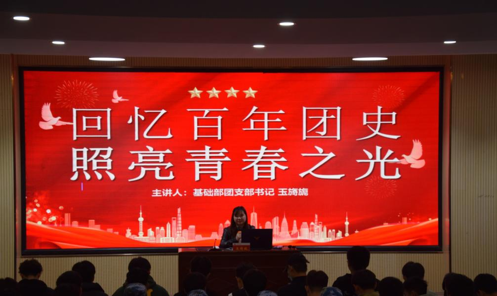 回顾百年历程,追忆光荣岁月。回顾这百年的峥嵘岁月,中国共青团踏平坎坷,扬荣弃耻。为了切实做好团史学习教育,引导共青团员深刻感悟新时代党和国家事业发展的伟大成就和党领导中国青年运动的光辉历程,根据校团委部署,3月29日晚上,基础部在教学楼第三报告厅举行了“回忆百年团史 照亮青春之光”主题团课。参加此次主题团课的人员为基础部各班团支部成员、本次入团积极分子以及全体学生会干部。此次讲座的主讲人为基础部团总支书记玉旖旎老师。
