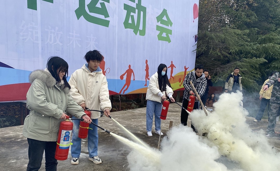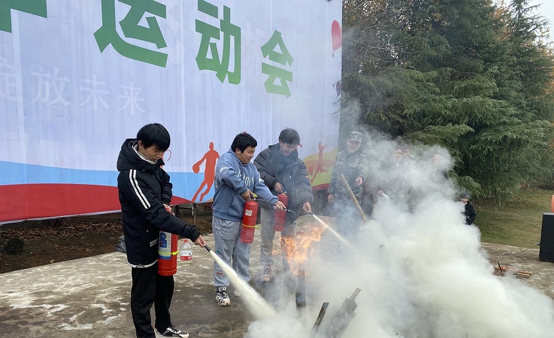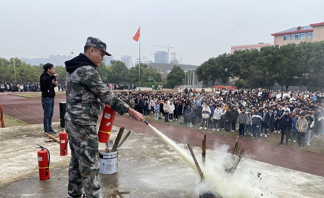 教官向师生展示了灭火器使用方法,并指导现场师生进行灭火