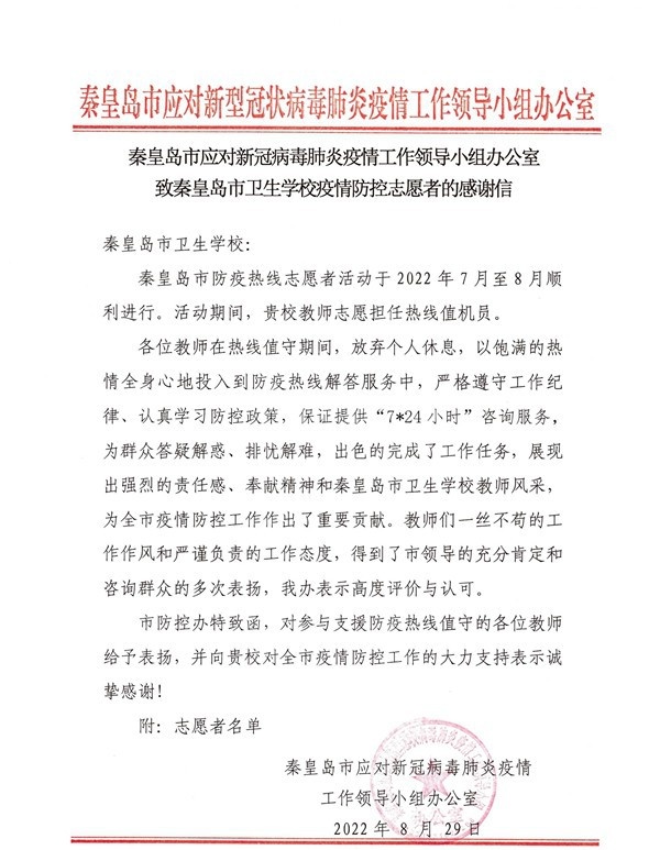 ';近期,正值我市暑期旅游旺季,来返秦人员密集,疫情防控形势复杂、任务艰巨。为助力我市疫情防控工作,为一线抗疫贡献力量,在市教育局的统筹协调下,8月19日至26日,我校组织56名志愿者圆满完成了市防控办防疫热线接听工作,获得市防控办和市教育局高度评价。